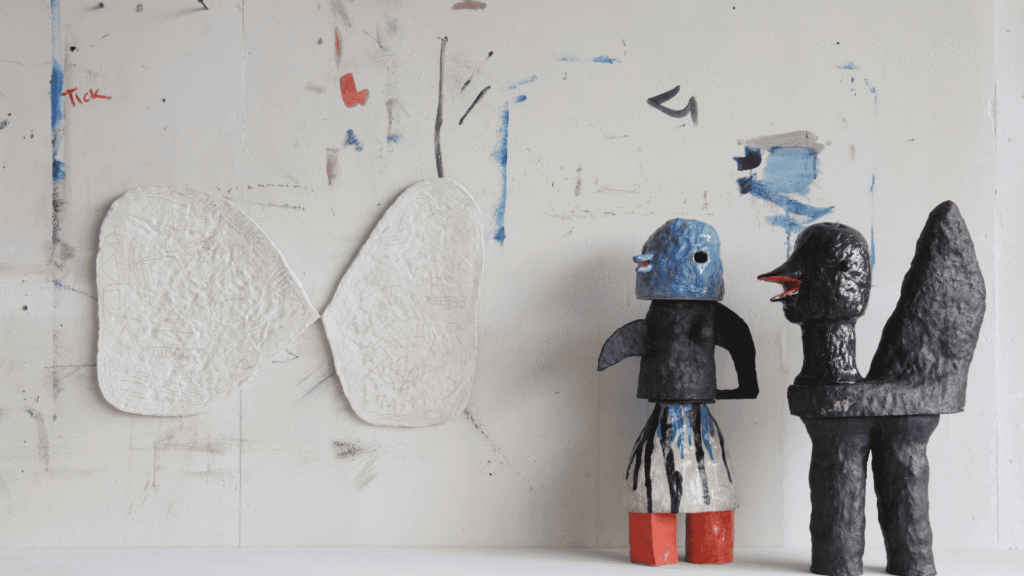 Mixta (madera tallada + acrílico). Árbol cuyas raíces forman manos entrelazadas, con pájaros de cerámica incrustados en las ramas. Fondos en tierras ocres y verdes musgo. Luz filtrada que proyecta sombras de partituras.